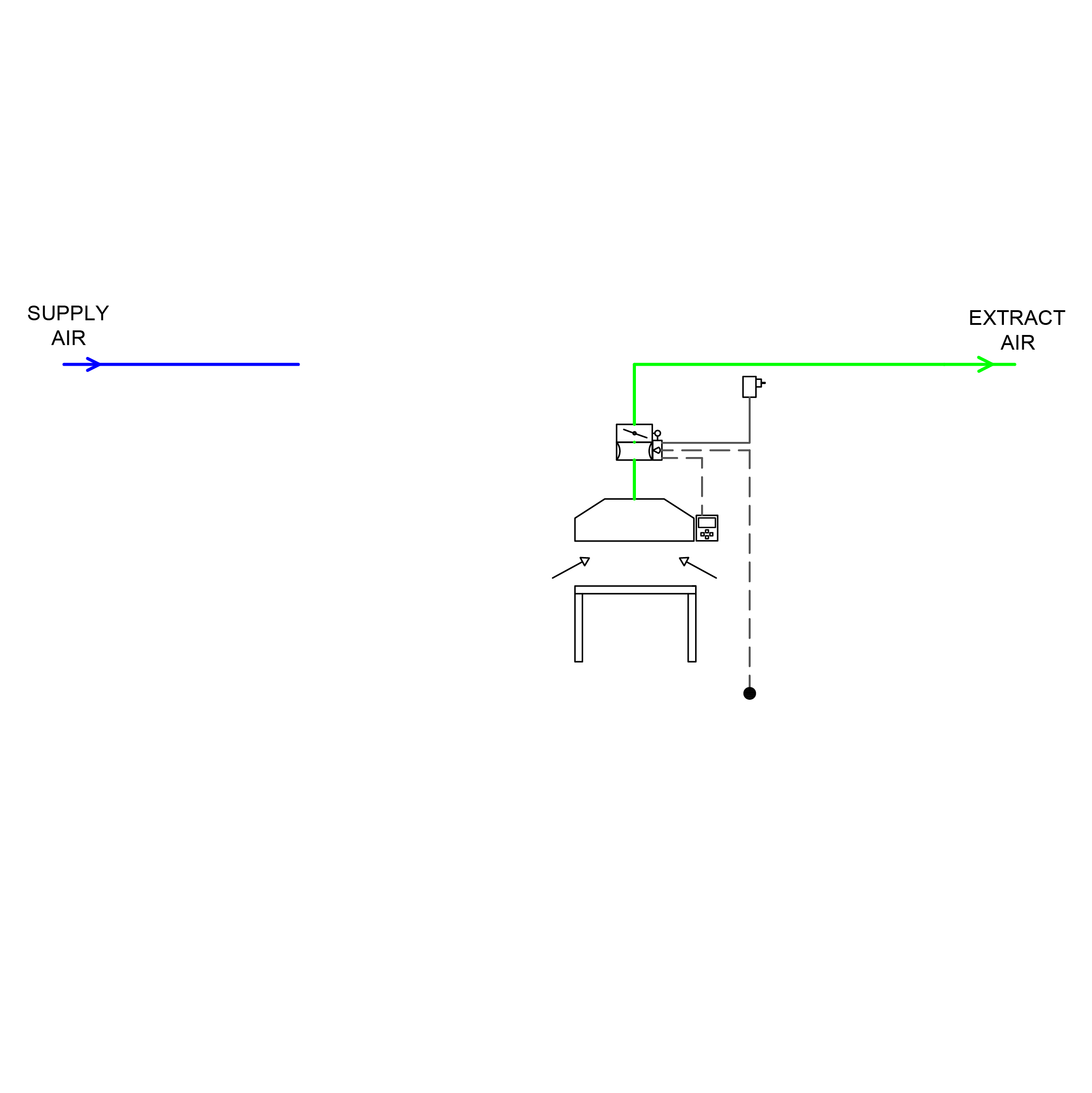 2-lägesstyrningen styr frånluftsflödet i min- eller arbetsläge, för att säkerställa inställt flöde i draghuven.