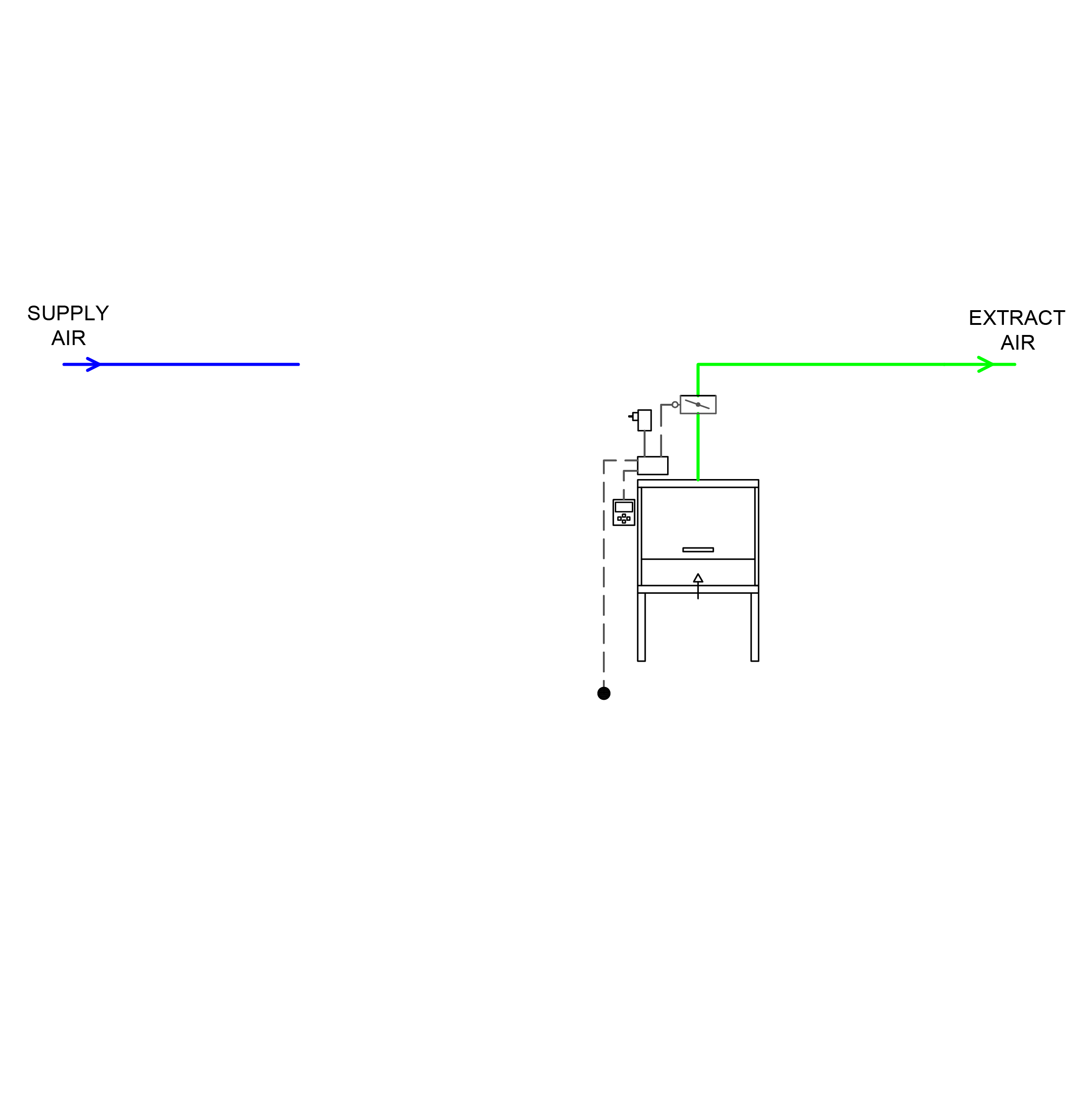Dragskåpsregulatorn styr frånluftsspjället, för att säkerställa inställd lufthastighet i dragskåpets lucköppning.